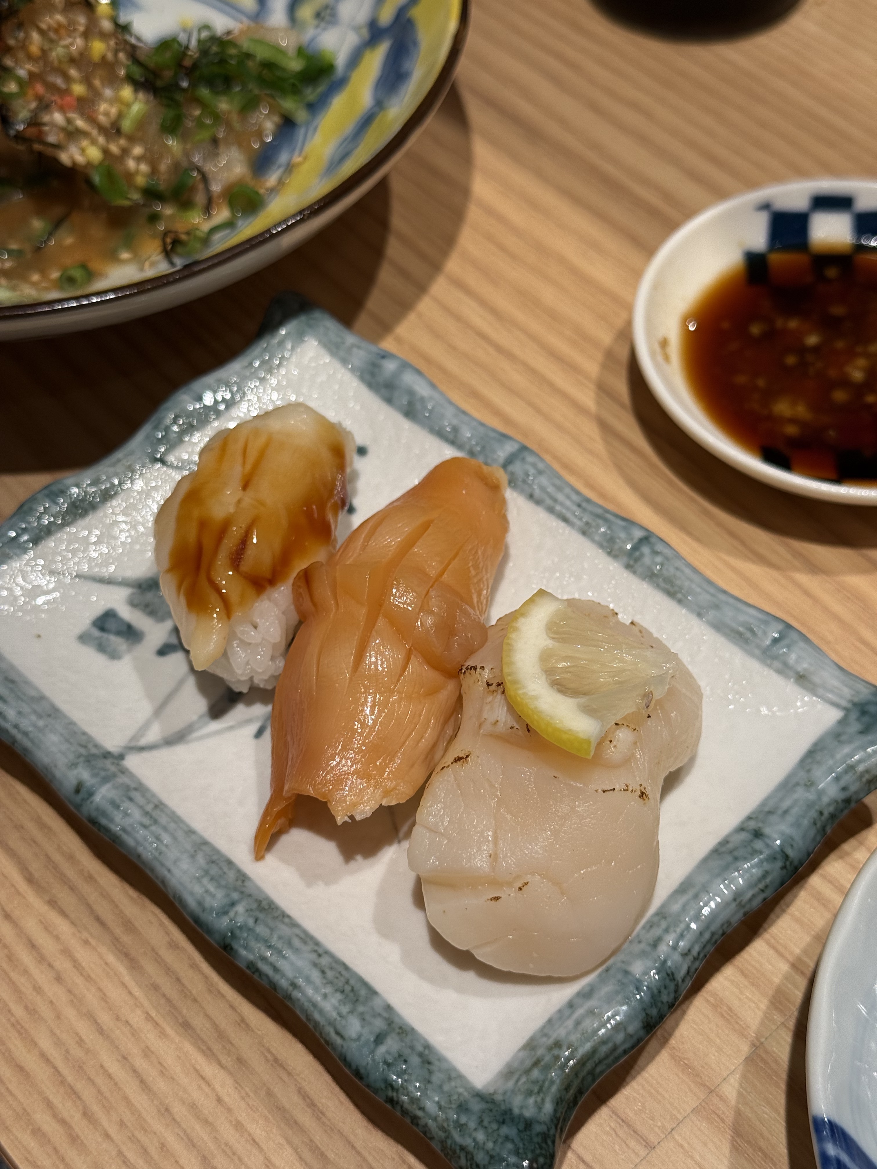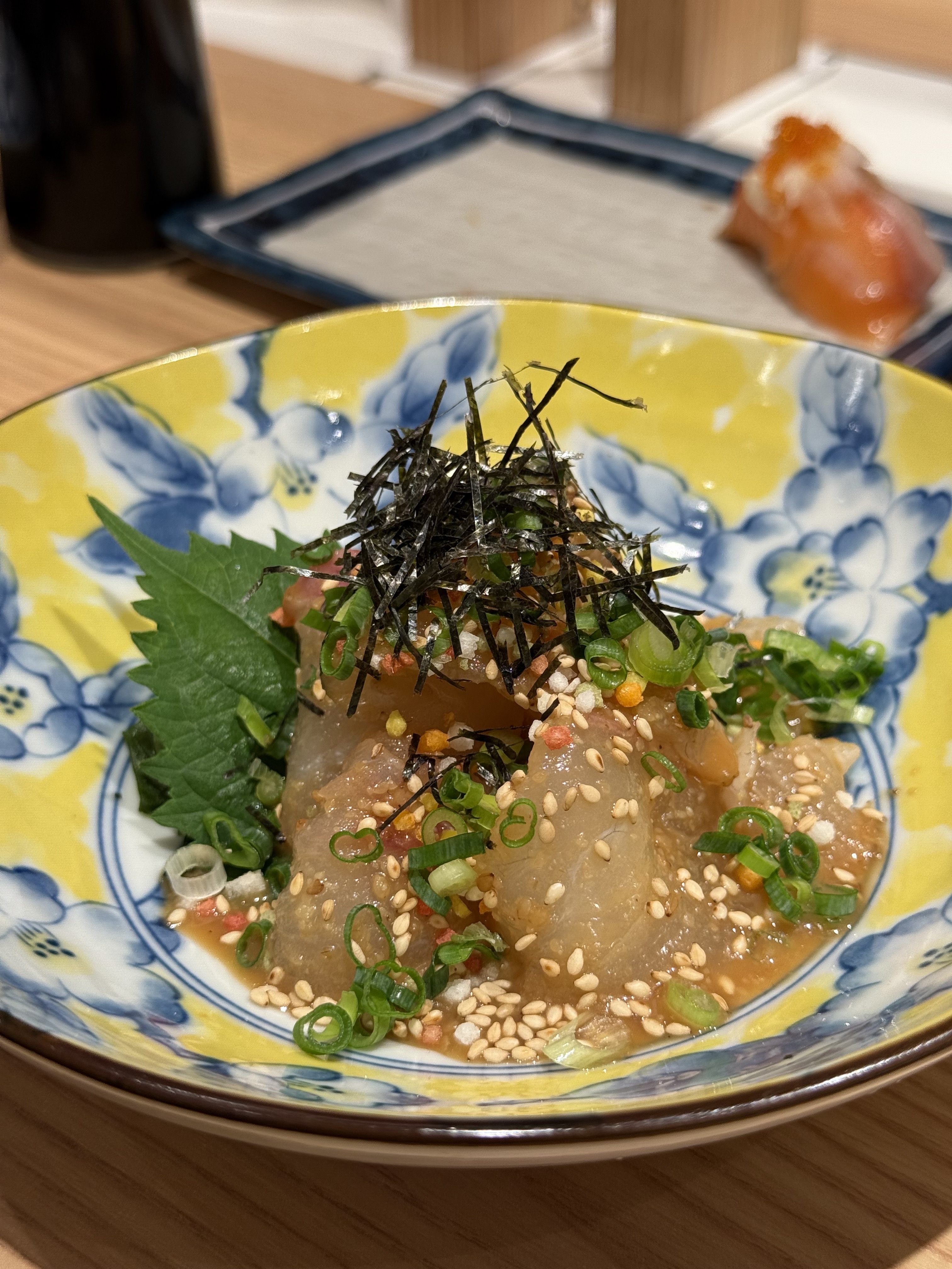 餐廳的鮭魚、鮪魚、鯛魚品質極佳!特別推薦胡麻鯛魚,這道福岡特色美食在此加入香鬆、蔥花和紫蘇葉,提升了爽口度和層次感,是我的最愛。