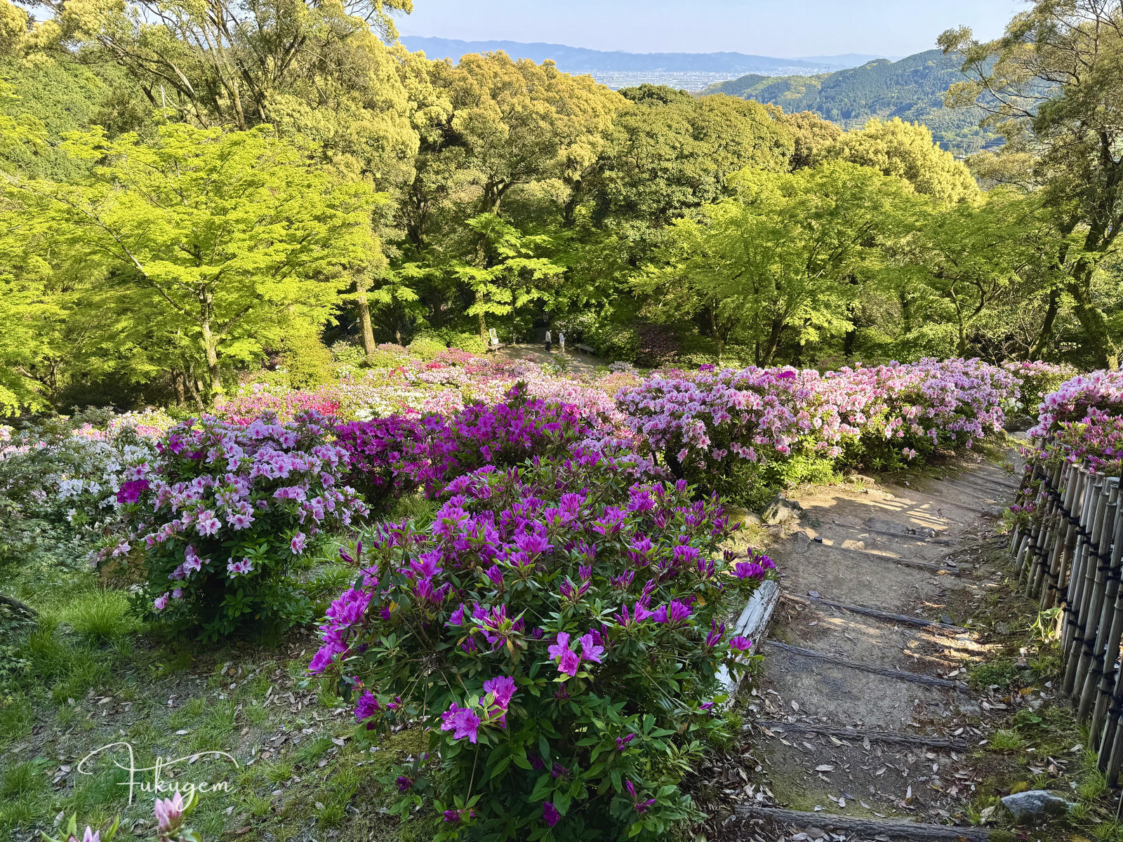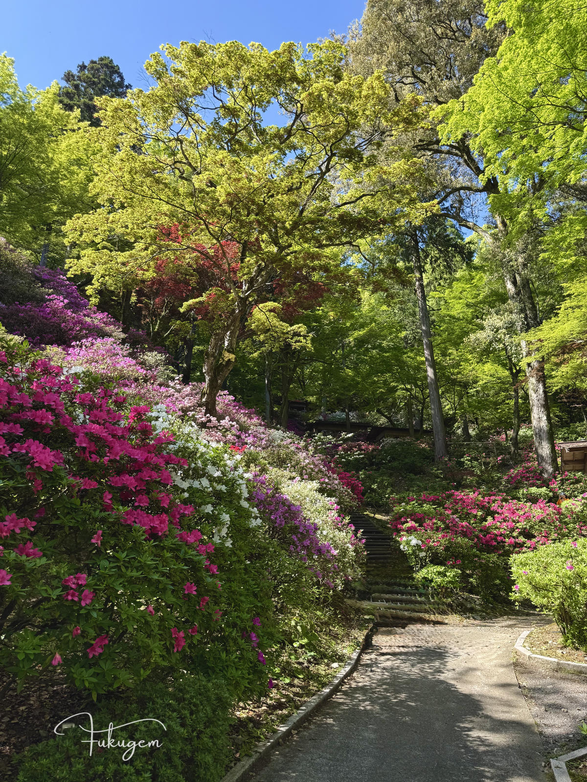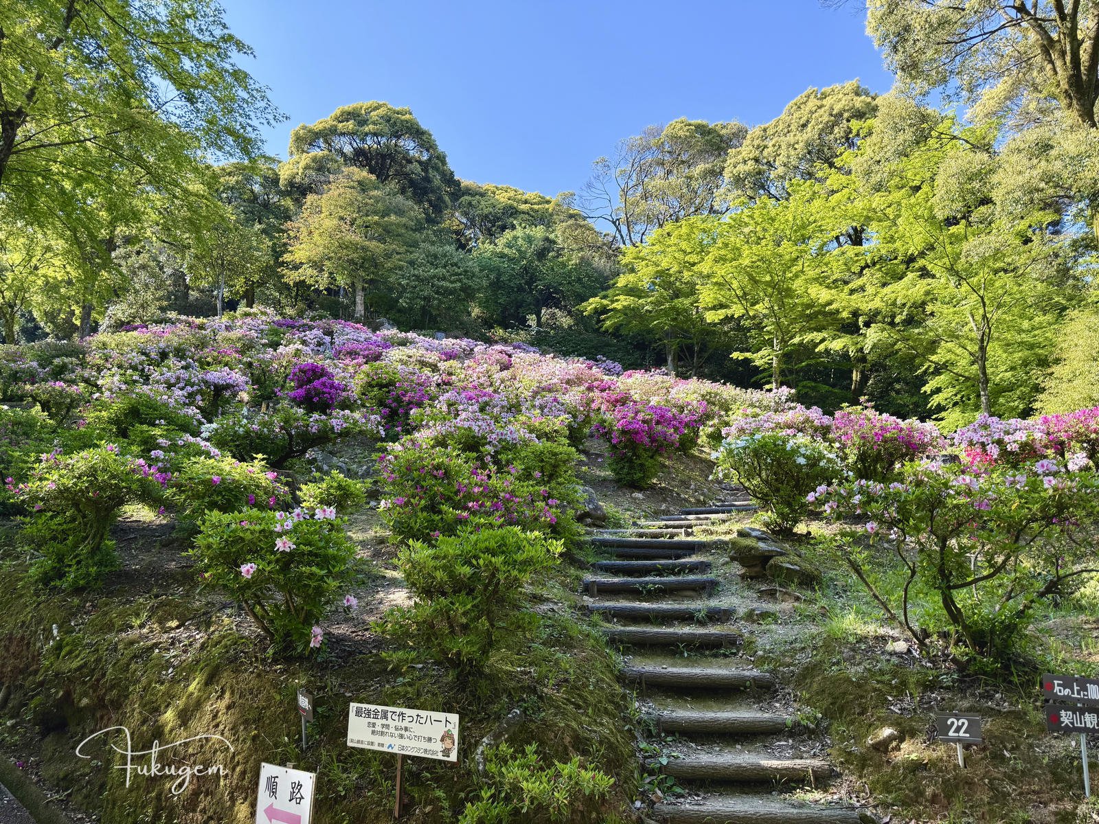 大興善寺的春日杜鵑花海是福岡近郊最受歡迎的賞花盛事,契園內的5萬株、約50種杜鵑花齊放,形成一片粉色浪漫花谷。杜鵑花主要分布於寺院後方契園的山坡與步道,參觀路線為步行參道,依地形上下坡。最佳觀賞時間通常落在每年四月下旬至五月上旬,其中又以四月下旬花況為最盛時期。契園的杜鵑花不僅數量龐大,色彩也豐富多變,從深紅、粉紅到純白,錯落有致地覆蓋了整個山坡。園區內特別設有「戀人之聖地」的心形石,是情侶們拍照留念的熱門景點,沿著花叢小徑漫步,隨處都是令人心曠神怡的美景。建議避開週末假日高峰,選擇平日上午前往,享受更寬敞舒適的賞花體驗。另外,階梯數量較多,雖然寺方提供登山杖免費借用,但還是建議量力而為哦!