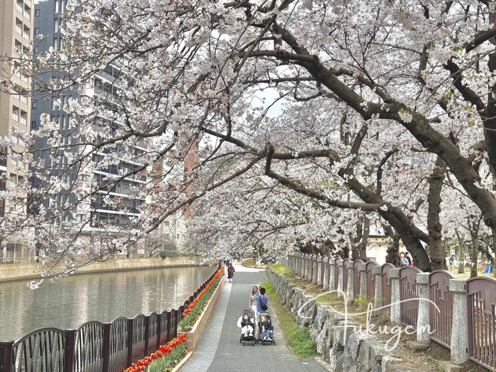 天神中央公園位於福岡市中心,鄰近天神商圈,櫻花主要分布在河岸步道周邊