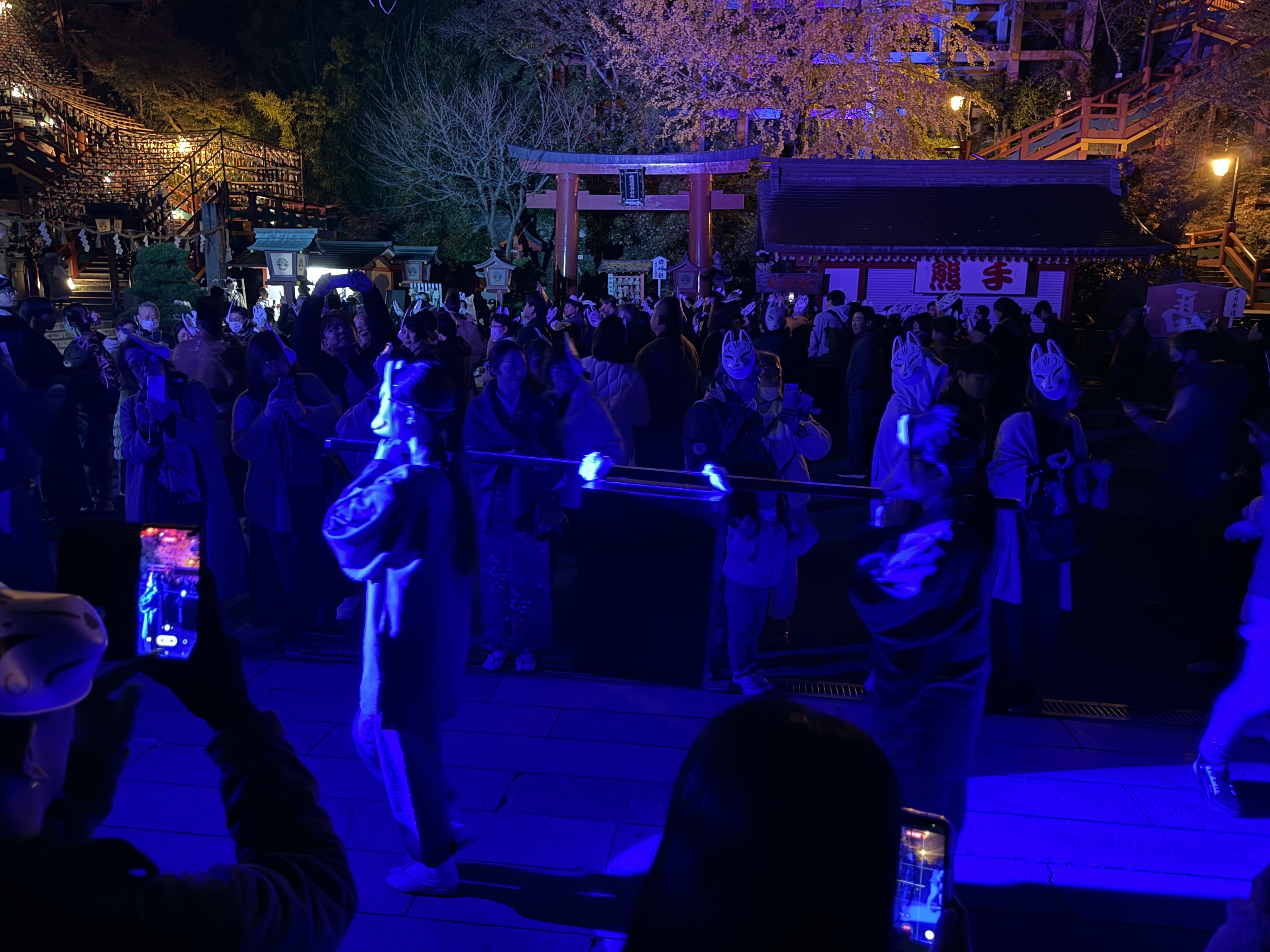 遊客可以戴上特製的狐狸面具,作為婚禮嘉賓參與這場獨特的夜間遊行。在神道教祭司的引導下,戴著狐狸面具的新郎新娘與雅樂隊伍,從神社前的街道一路遊行至神社境內,營造出一個光、聲、幻想與神話交織的特殊時刻。這是一場以「斷惡交良」為主題的秋季儀式,不僅充滿視覺震撼,也帶有祈求良緣的美好寓意。