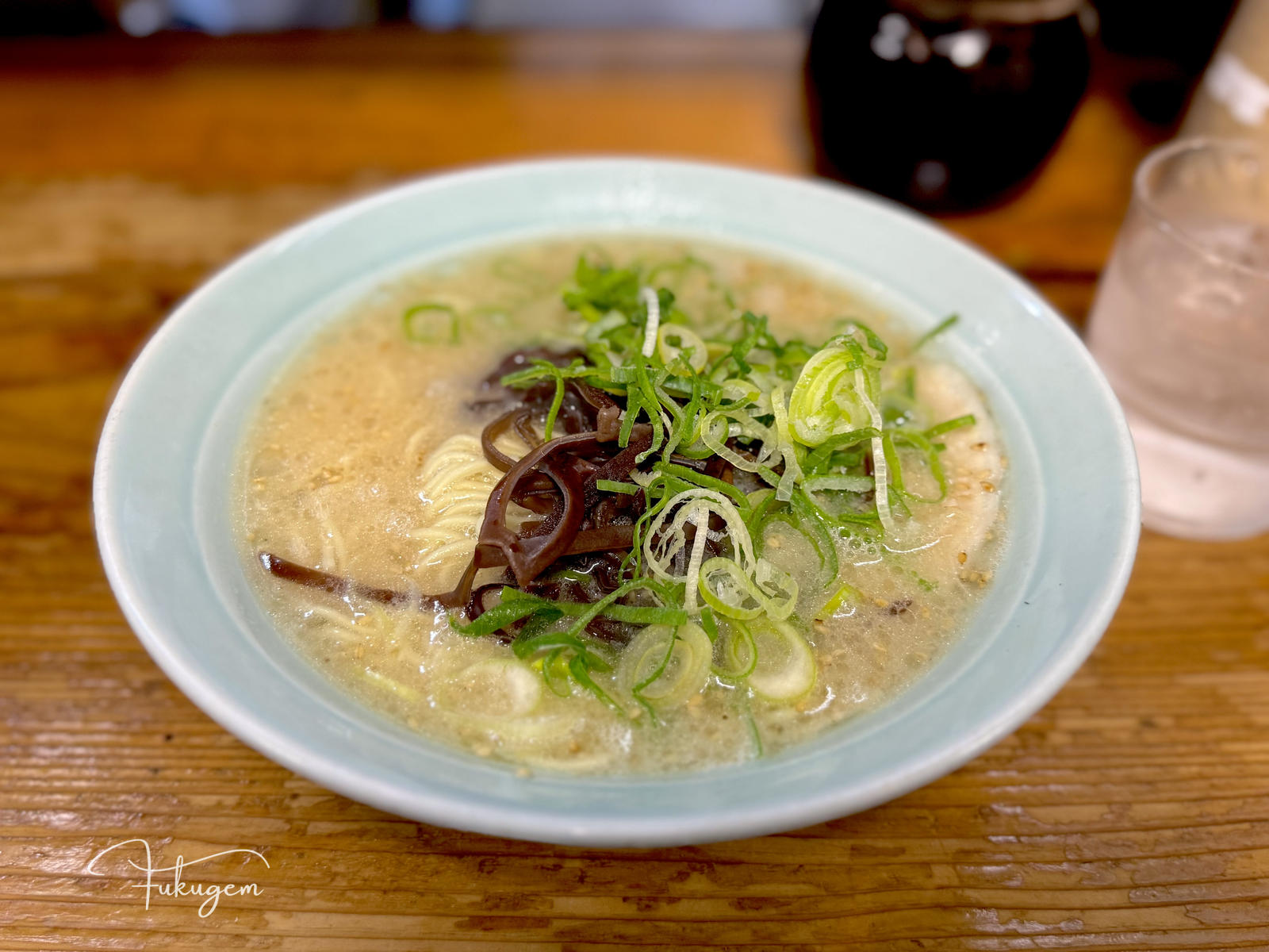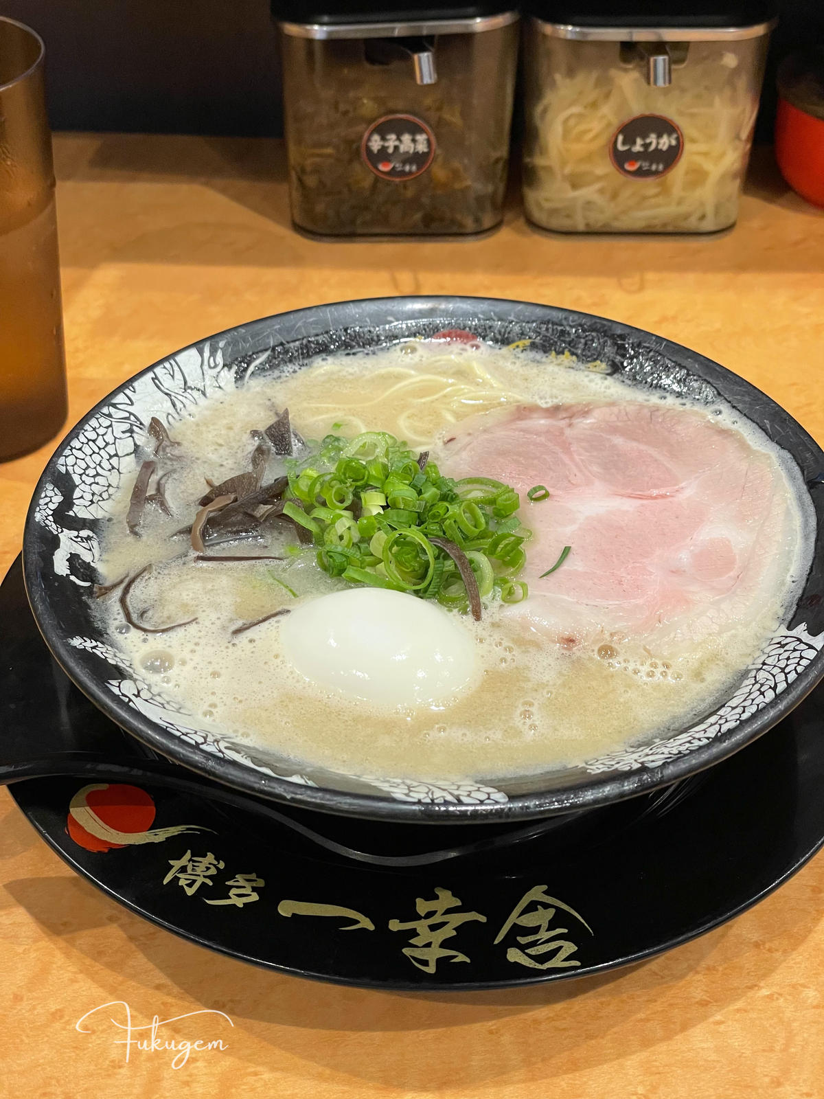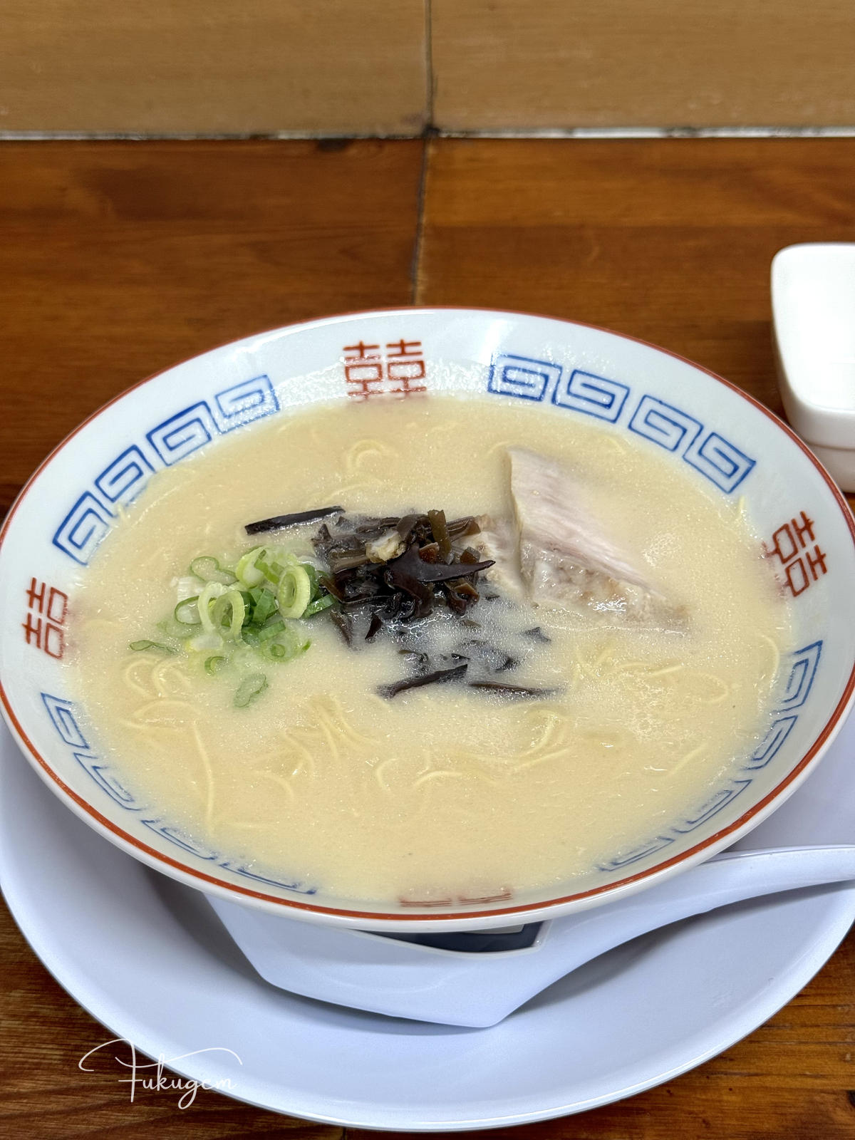 這間連續五年拿到 Tabelog 百名店、位於吳服町住宅區內、門口連招牌都沒有,僅憑一個藍色水桶作為開業標記的博多元氣一杯!!,曾是福岡規則最嚴苛的名店。過去這間店禁止滑手機、禁止拍麵,甚至若不先喝一口湯就直接吃麵或攪拌,老闆真的會請你離開。雖然現在老闆的性格已變得溫柔,店內也開放拍照,也開始聘請外籍員工,但那份對風味的堅持依然沒變:上桌時,店員仍會溫馨提醒請先從湯開始品嚐。
