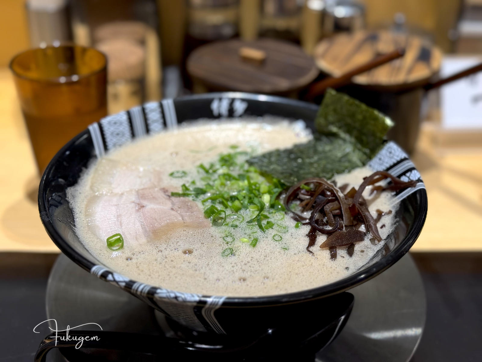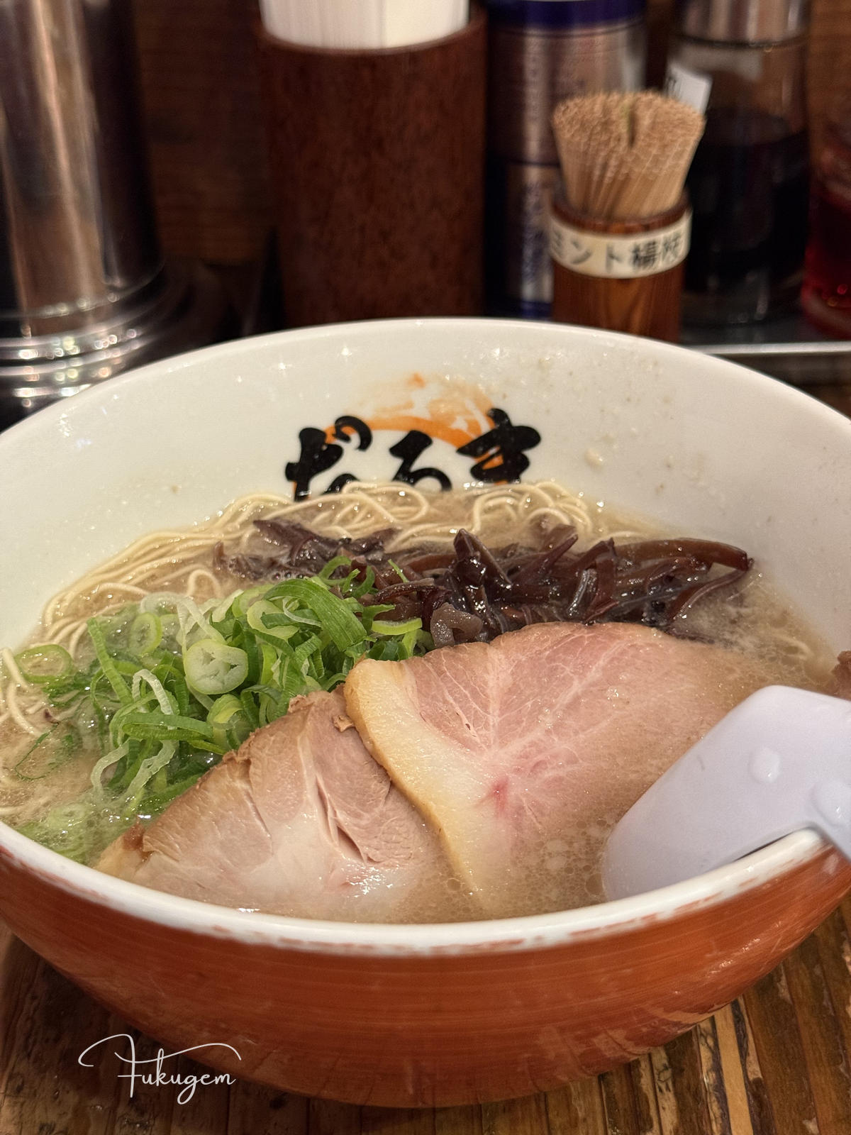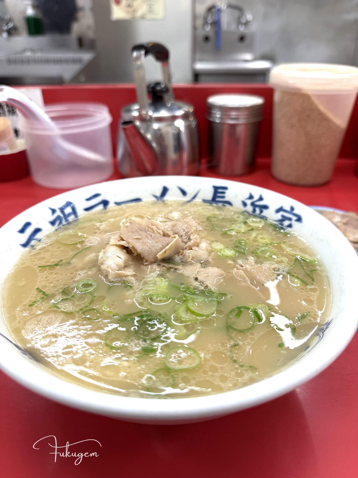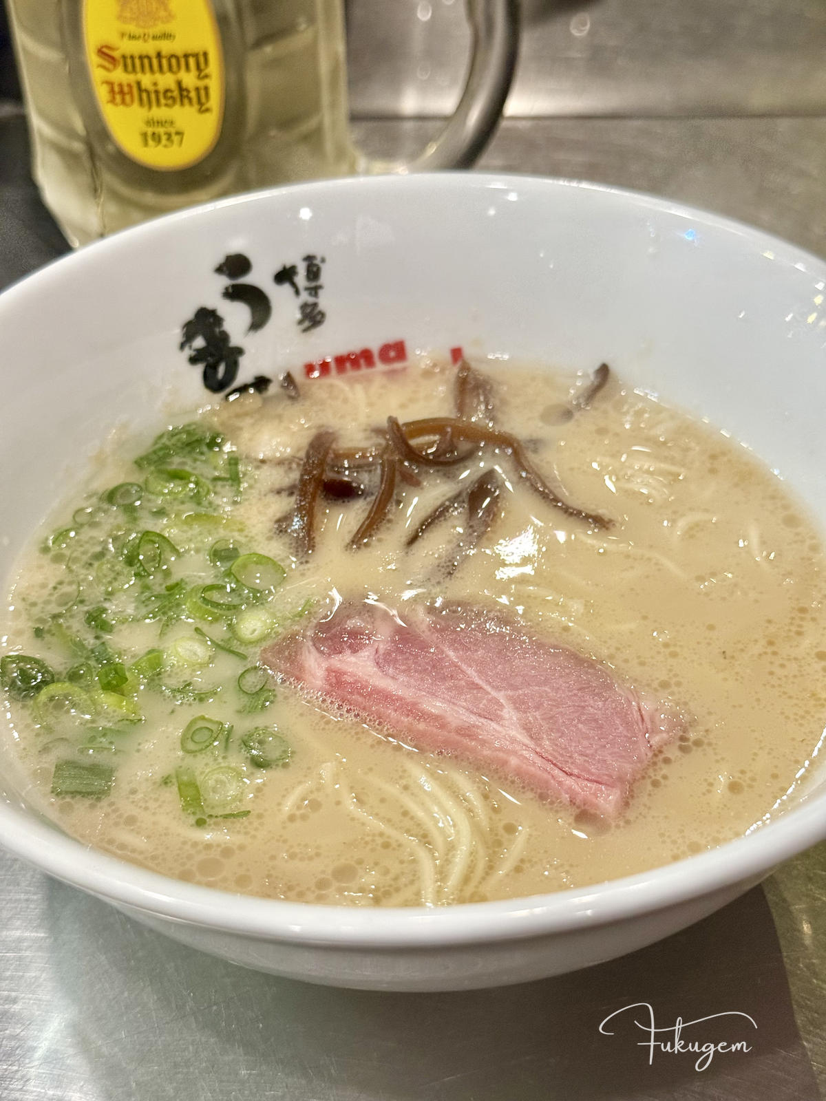 這間連續五年拿到 Tabelog 百名店、位於吳服町住宅區內、門口連招牌都沒有,僅憑一個藍色水桶作為開業標記的博多元氣一杯!!,曾是福岡規則最嚴苛的名店。過去這間店禁止滑手機、禁止拍麵,甚至若不先喝一口湯就直接吃麵或攪拌,老闆真的會請你離開。雖然現在老闆的性格已變得溫柔,店內也開放拍照,也開始聘請外籍員工,但那份對風味的堅持依然沒變:上桌時,店員仍會溫馨提醒請先從湯開始品嚐。