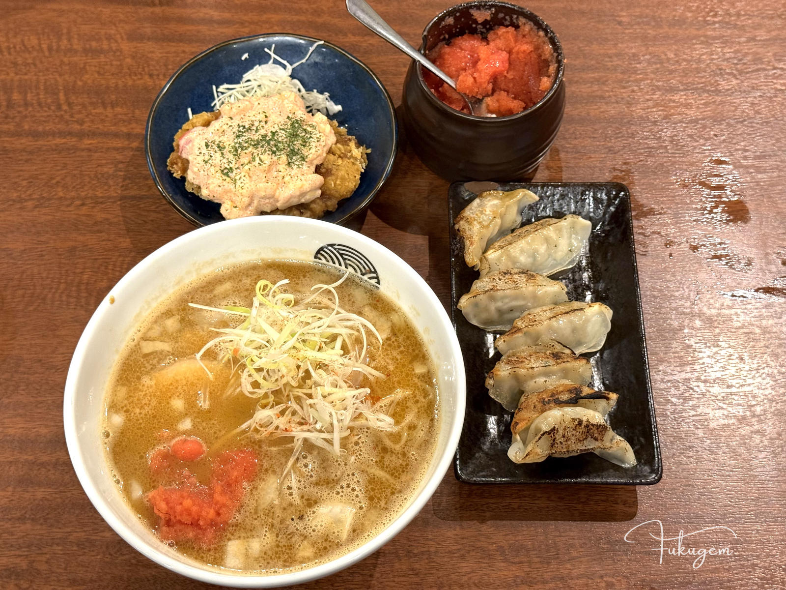 我特愛這間的原因在於這碗麵的變化:強烈推薦加入桌面上免費提供的特製辣椒。微辣的刺激感並不會掩蓋豬骨精華,反而像是一把鑰匙,瞬間勾勒出湯底的層次感並提煉出食材的香氣。另外,煎餃皮薄又脆,也是福岡當地招牌口味。如果你追求的是那種夠臭才道地且不花俏的博多日常味,這裡絕對是你在繁華商圈中最值得推開的那扇隱藏大門。